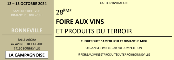Nous serons présents à la FOIRE AUX VINS ET PRODUITS DU TERROIR de BONNEVILLE (74) du samedi 18 au dimanche 19 octobre 2025, salle AGORA, 42 avenue de la gare.