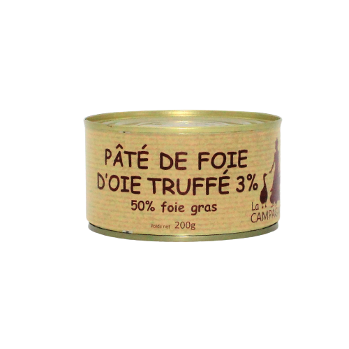 Véritable spécialité de la région héritée de nos grands-mères, le Pâté de Foie Gras d’Oie Truffé de La CAMPAGNOISE est composé de 50% de foie gras d’oie truffé, de 3% de truffe noire dessus et au cœur et d’un jus de truffe qui parfume très délicatement la chair de porc. Un pâté « 1ère Classe » qui associe deux des produits les plus nobles du Sud-Ouest, une fierté de La CAMPAGNOISE !