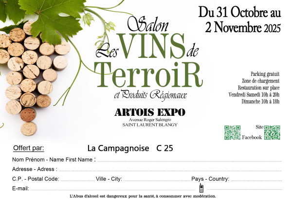 Nous serons présents au salon Les VINS de TerroirR et Produits Régionaux d’ARRAS, stand C25,  Artois Expo, St Laurent Blangy du 31 octobre au 2 novembre 2025.